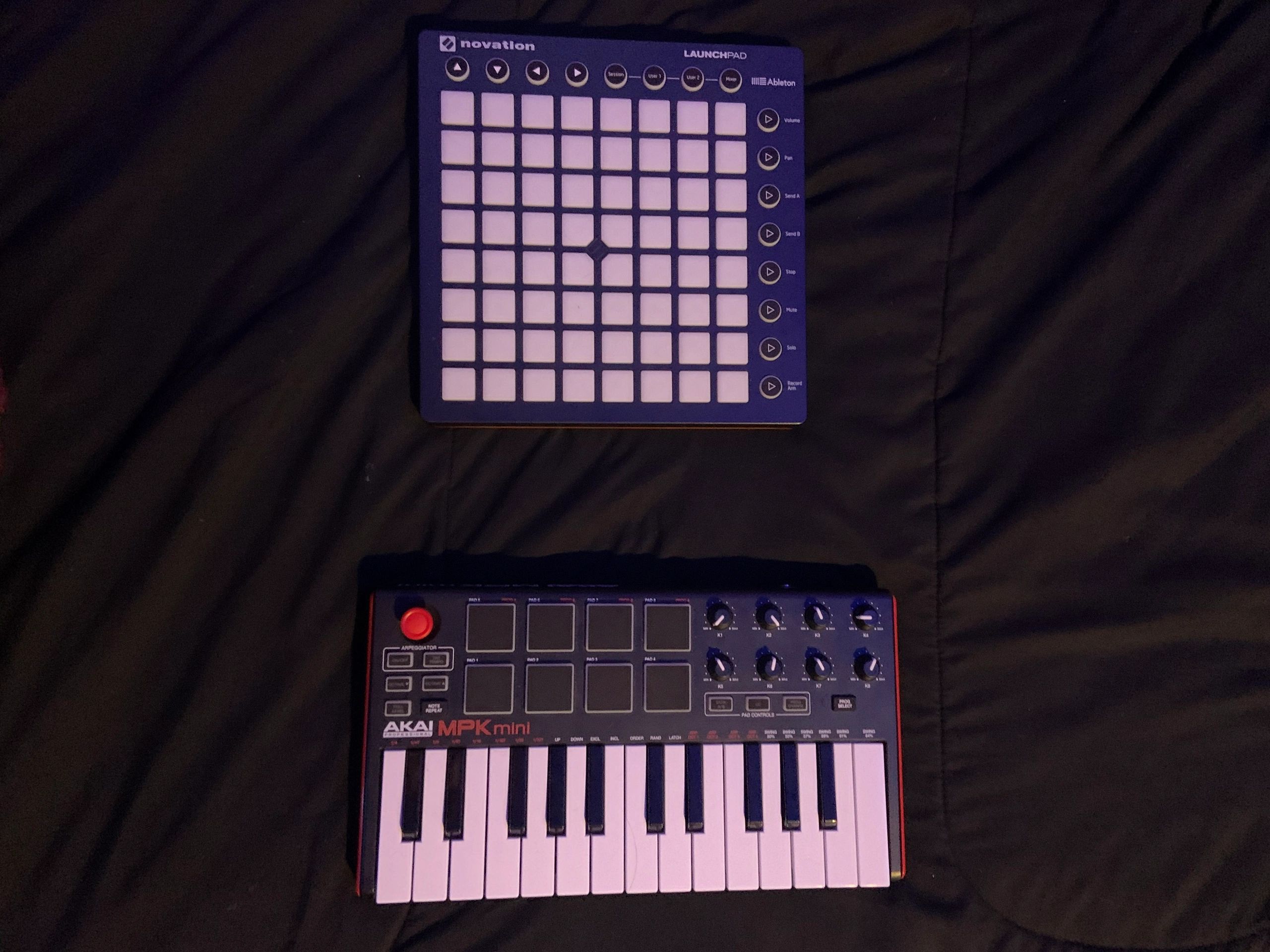 I use Ableton as my DAW (Digital Audio Workstation). I like it because it’s all neat and organized, it’s easy to find stuff, and it’s easy to connect devices or download plug-ins. I use a Launchpad (top) and an Akai Mini (bottom) for playing music/recording music. The button will lead you to an Amazon link for the launchpad I bought, which comes with Ableton Live 10 Lite.